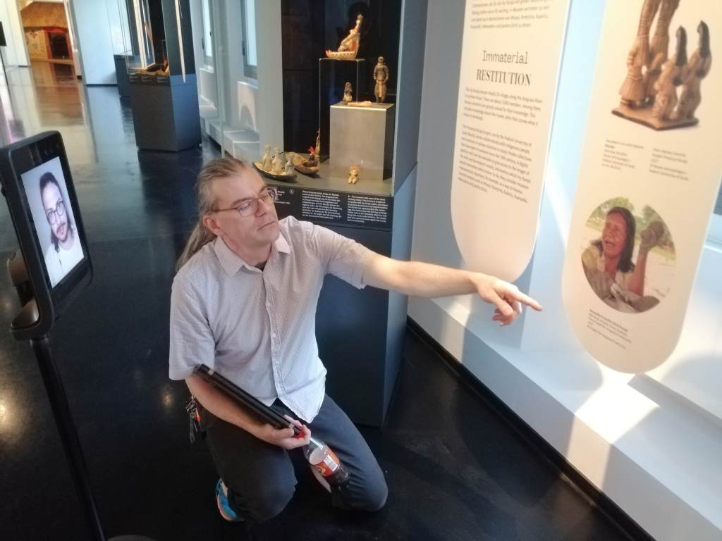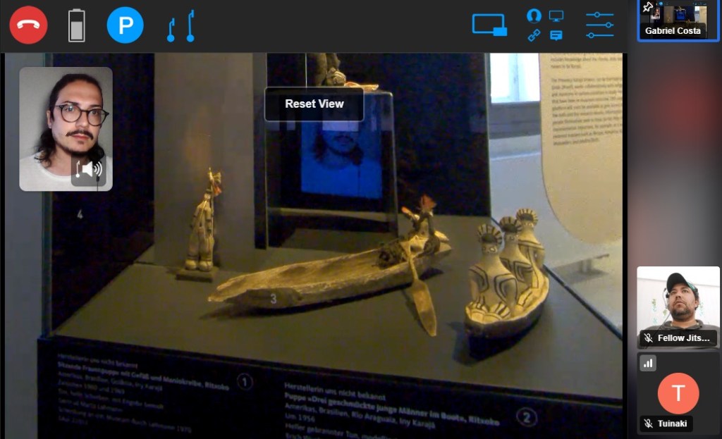 Research partners from the international project „Presença Karajá“ with partners in Brazil, Belgium, Portugal, and Canada visited our Leipzig exhibition last week using ELIPS (our new fleet of telepresence robots). They took a closer look at the “Room of Remembrance” and at a display of ritxoko dolls from the Iny Karajá in Brazil. Ritxoko are dolls traditionally made of unburnt clay and wax, representing social and gender roles in Iny Karajá communities for children. After World War II, ritxoko were increasingly made of burnt clay, became larger, and are produced also for the tourist market, thus providing a source of income. Their female producers, the ceramistas, are revered in their communities. Ritxoko have recently been listed as part of national cultural heritage in Brazil. The Project Presença Karajá“ seeks to identify ritxoko in museum collections worldwide and to build an online database that is supposed to reconnect Iny Karajá with historical dolls, patterns and production methods, and to serve researchers worldwide.